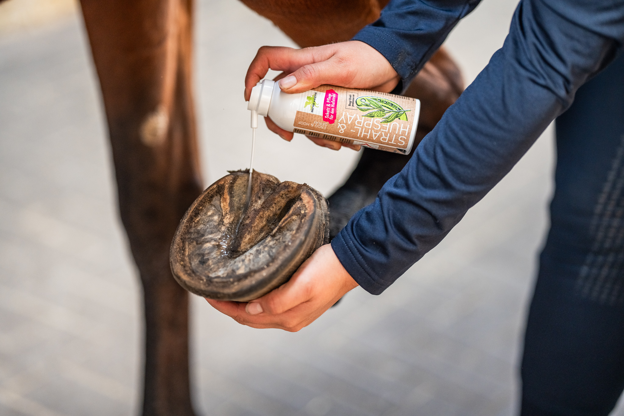 Setze unser Strahl- und Hufspray nach dem Ausschneiden und zusätzlich 1–2x wöchentlich ein. Es legt einen schützenden Film über Strahl und Sohle und schützt zuverlässig vor Bakterien.